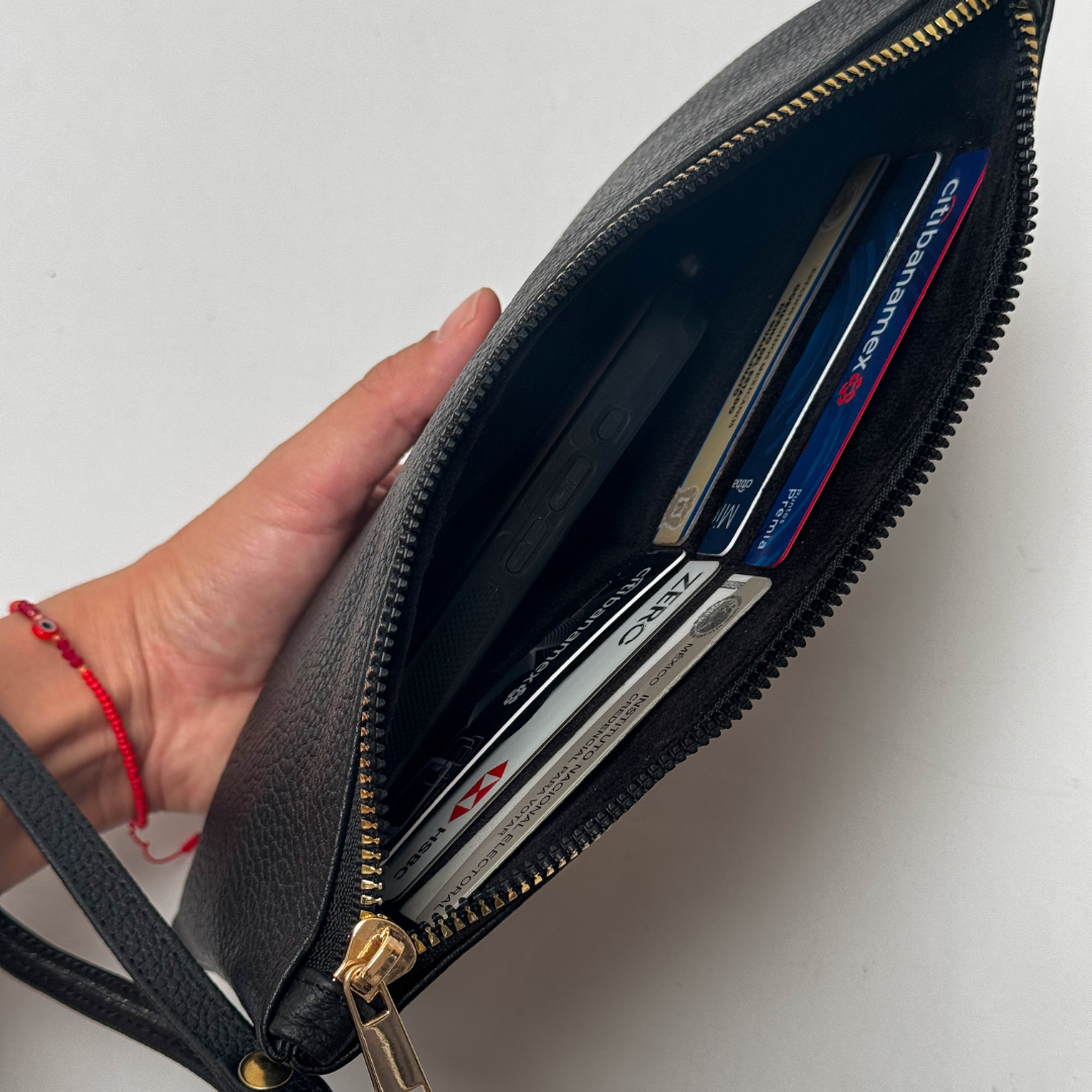 Clutch negraa. Esta pieza está elaborada en 100% piel genuina, que puede conservar marcas naturales, lo cual garantiza su autenticidad. Cuenta con tarjetero interno
